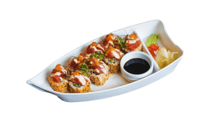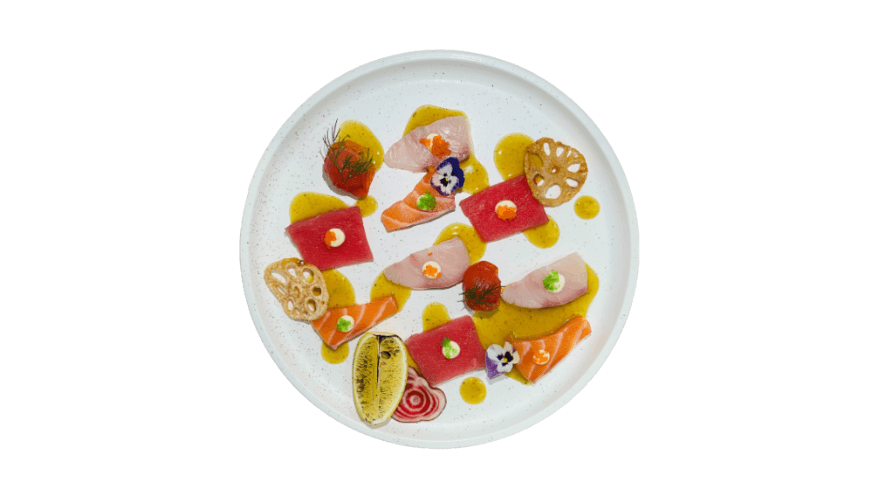 Line-caught yellow-fin tuna sashimi with Wasabi mayonnaise, Korean spicy sauce, tobiko, spring onion and Japanese 7 spices
