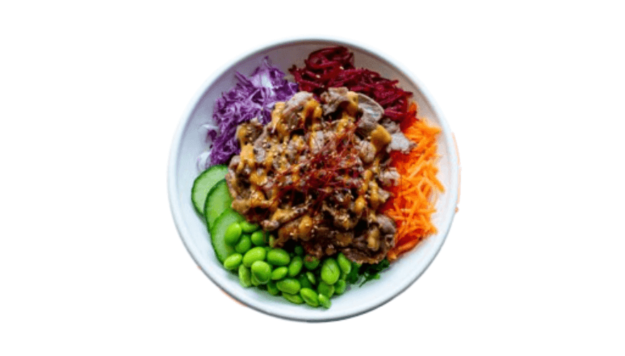 Flame grilled wagyu beef on mixed purple rice, mixed salad leaves, beetroot, carrot, purple cabbage, cucumber, edamame, and seaweed salad, classic poke dressing, and sesame mayo, garnished with shredded chili, and sesame seeds