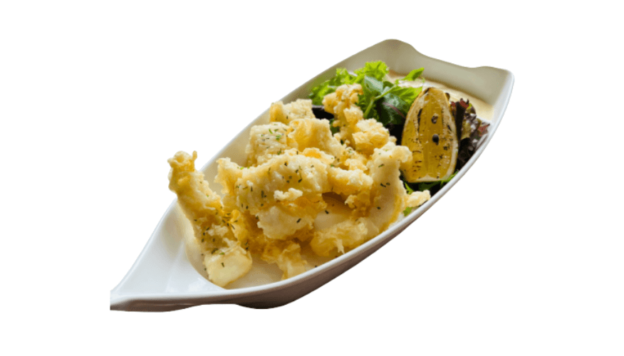 Calamari with yuzu aioli, lemon wedge and ao bara nori on side salad