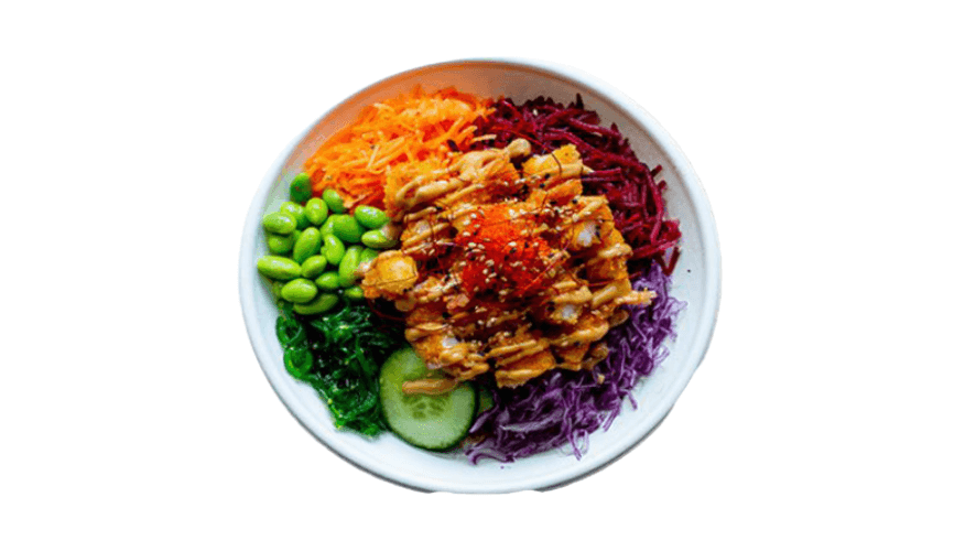 Prawn tempura on mixed purple rice, mixed salad leaves, beetroot, carrot, purple cabbage, cucumber, edamame, and seaweed salad, classic poke dressing, and sriracha mayo, garnished with caviar, shredded chili, and sesame seeds