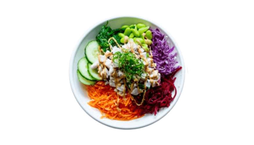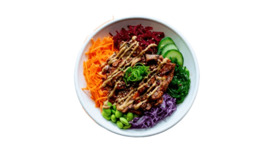 Frame-grilled chicken breast on mixed purple rice, mixed salad leaves, beetroot, carrot, purple cabbage, cucumber, edamame, and seaweed salad, classic poke dressing, and sesame mayo, garnished with spring onion, and sesame seeds