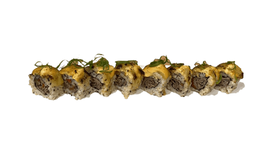 Premium wagyu beef grilled with classic sauce, sriracha mayonnaise, sesame seeds, colby cheese and kizami Wasabi