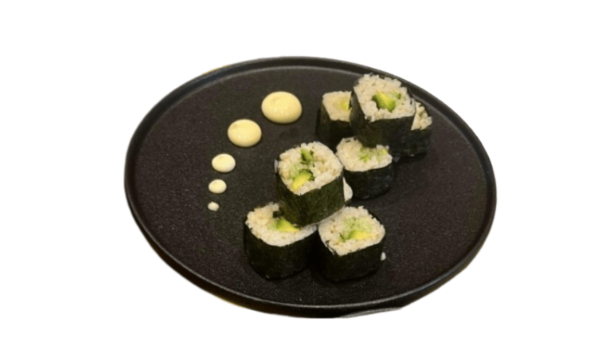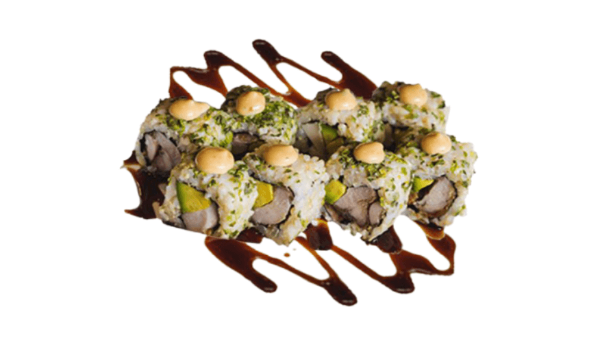 Barbecue chicken thighs rolled with ao nori, mayonnaise, Japanese pickles and avocado