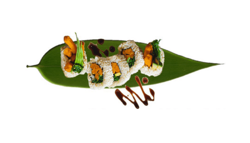 Pumpkin, seaweed, and avocado rolled in rice crackers with teriyaki glaze