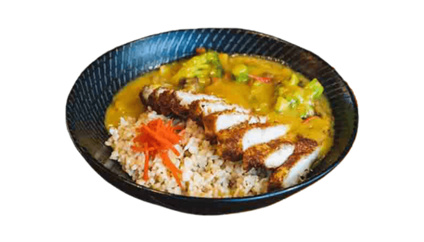 Choice of rice or udon noodles with crispy breaded chicken, curry sauce, potato, carrots, caramelized onion and pickles
