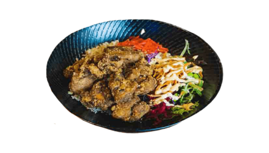 Japanese style fried chicken on rice, side salad, pickles, lemon wedge and sriracha mayonnaise