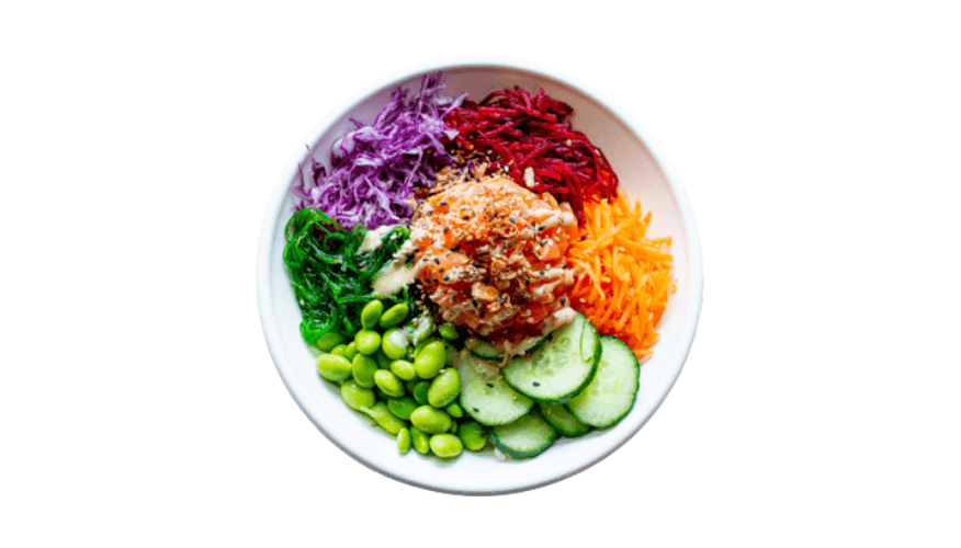 Sashimi or flame-grilled salmon on mixed purple rice, mixed salad leaves, beetroot, carrot, purple cabbage, cucumber, edamame, and seaweed salad, classic poke dressing and sesame mayo, garnished with fried shallots and sesame seeds