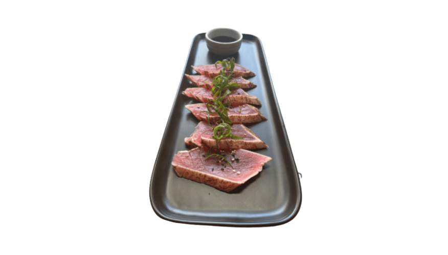 Lightly grilled tuna sashimi with sesame seeds, spring onion, Japanese 7 spice and ponzu