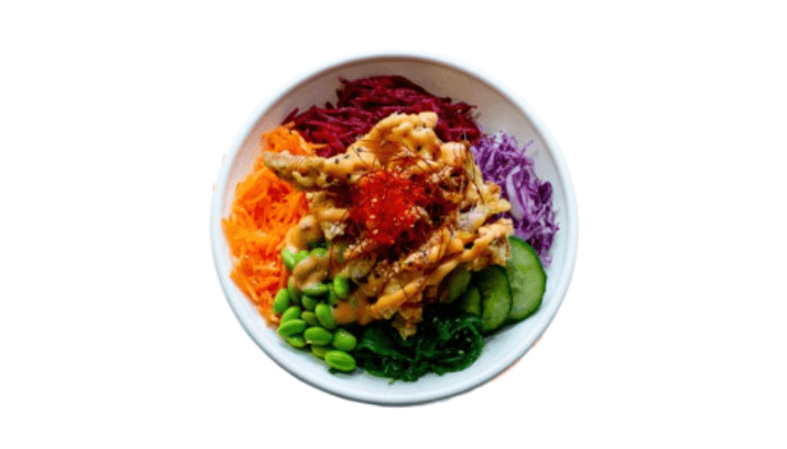Soft-shell crab tempura on mixed purple rice, mixed salad leaves, beetroot, carrot, purple cabbage, cucumber, edamame, and seaweed salad, classic poke dressing, and sriracha mayo, garnished with caviar, shredded chili, and sesame seeds