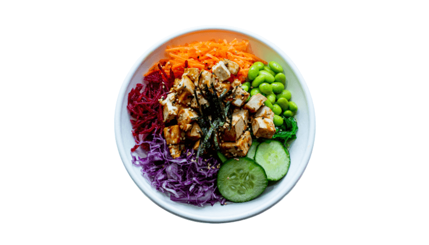 Marinated tofu on mixed purple rice, mixed salad leaves, beetroot, carrot, purple cabbage, cucumber, edamame, and seaweed salad, classic poke dressing, and citrus dressing, garnished with nori strips, and sesame seeds