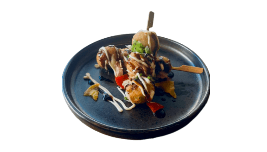 Traditional Japanese octopus balls on skewers with mayonnaise and okonomiyaki sauce, garnished with spring onion, ginger pickles and bonito flakes