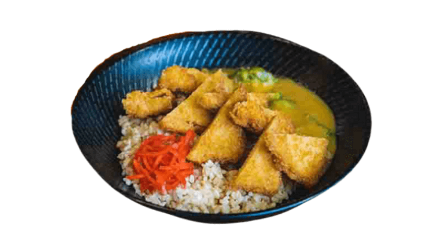 Choice of rice or udon noodles with crispy breaded tofu, curry sauce, potato, carrots, caramelized onion and pickles