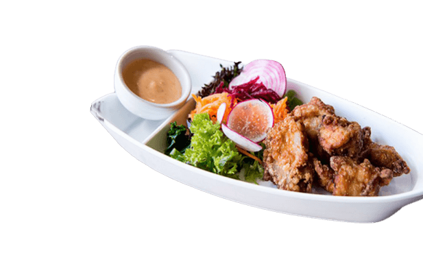 Japanese style fried chicken with lemon wedge and sriracha mayonnaise on side salad