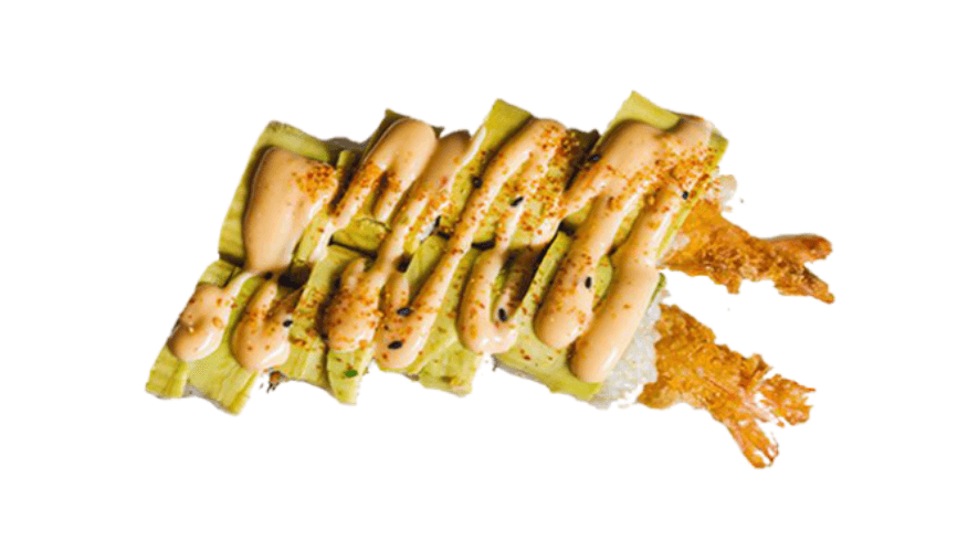 Prawn tempura rolled with avocado, sriracha mayonnaise and Japanese 7 spices