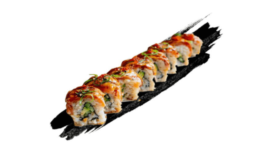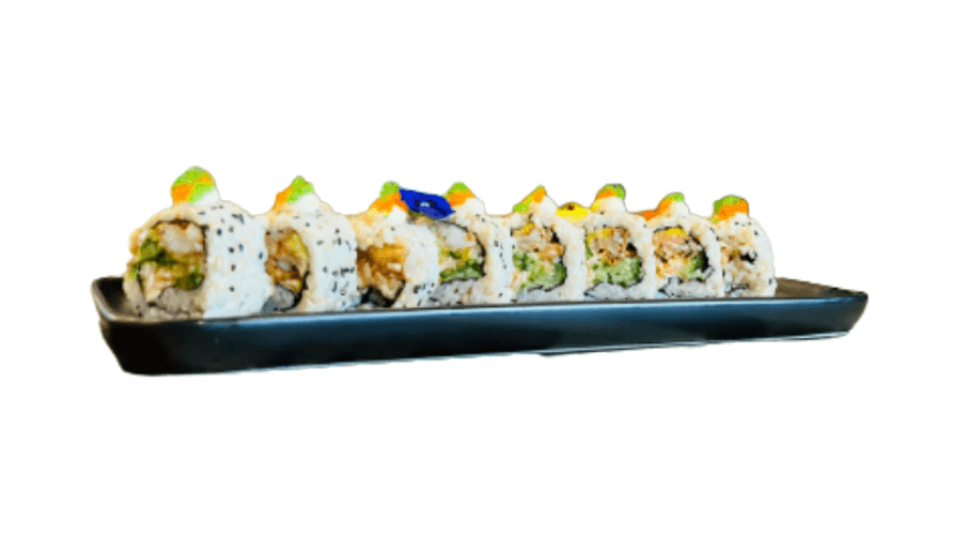 Inside out roll of soft-shell crab, lobster salad, avocado, cucumber, mayonnaise and tobiko