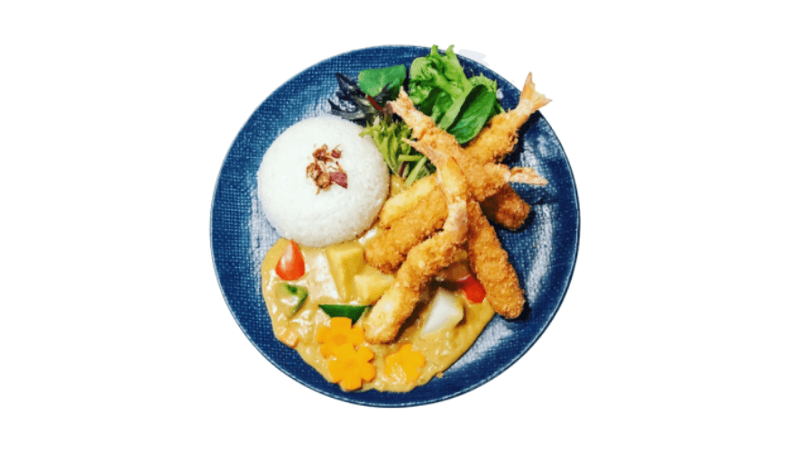 Choice of rice or udon noodles with battered prawns, curry sauce, potato, carrots, caramelized onion and pickles